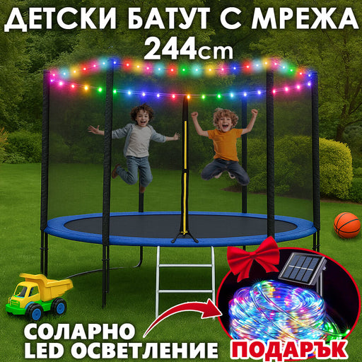 Original price 329,00 лв - Original price 329,00 лвOriginal price329,00 лв329,00 лв - 329,00 лвCurrent price 329,00 лвДетски батут с мрежа 244см с ПДОАРЪΚ LED Лампички – Подсилена конструкция и UV защита