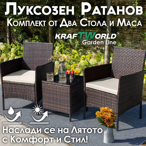vipmaistorСъздай мечтания си релакс кът на открито с KraftWorld Garden!Представяме ти модерен комплект от ратан в кафяв цвят – включващ 2 кресла, 1 двуместе...